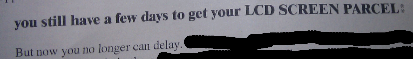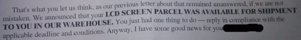 It’s there in the warehouse ready for me – as soon as I respond they’ll send me my LCD screen parcel! Hang on though – is there a difference between “LCD Screen” and “LCD Screen parcel”? I think I’d better take a quick look at the terms and conditions. (I couldn’t take a decent picture of the small print. It was too, well, small.)