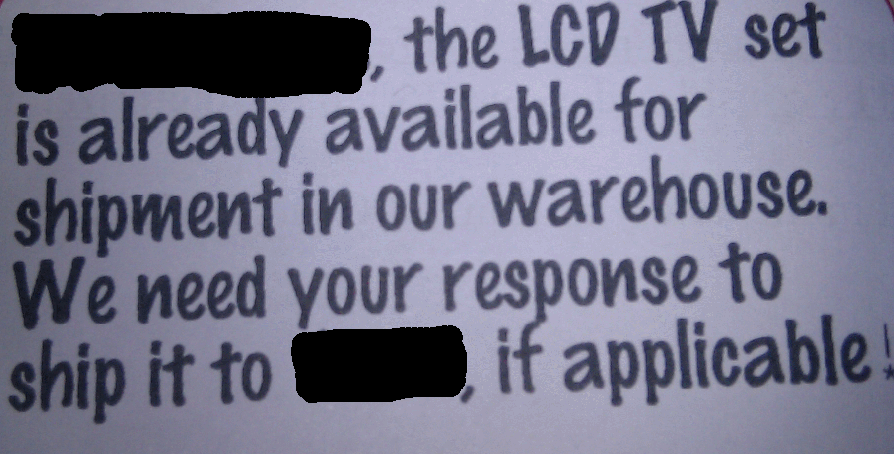 Hooray! Let’s ignore the words “if applicable” for now. They’re probably not important. I’ve won a TV!