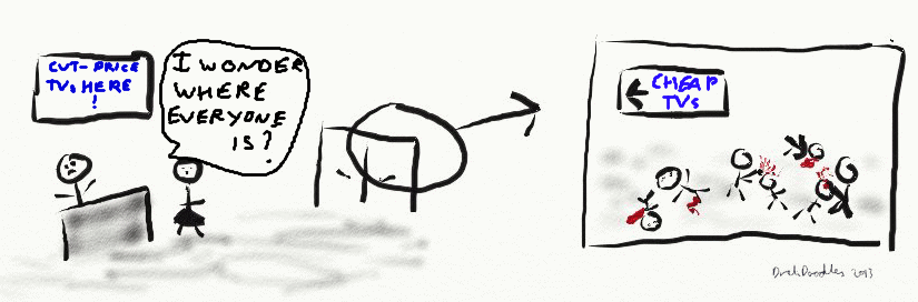Something about a single day of massive bargains seems to destroy all civilised thought. If people act like this over a cut-price TV or the last of the Furbies, I dread to think what might happen if some future disaster destroys the world’s food supply and people are queuing up to buy the last tin of baked beans on the planet.