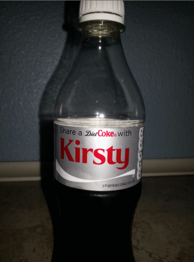 I bought this bottle of Diet Coke yesterday. “Share a Diet Coke with Kirsty”.