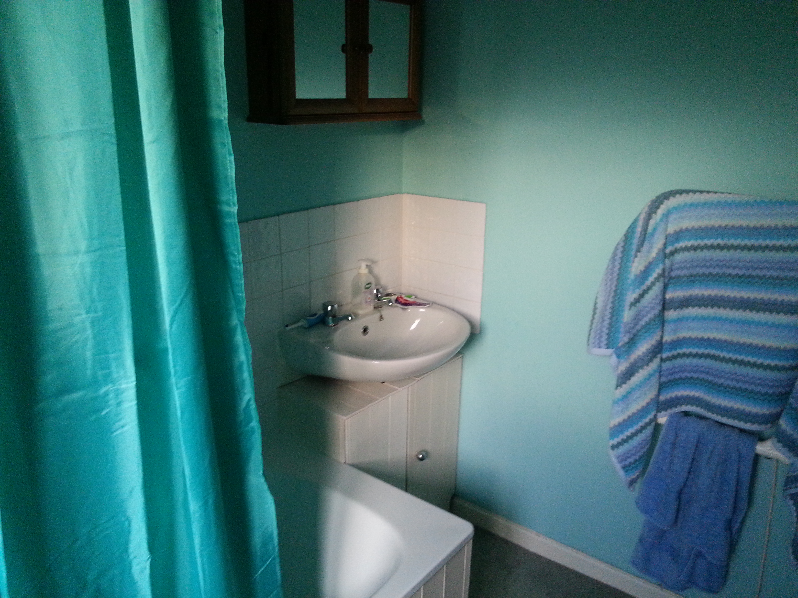 The bathroom was that colour when I moved in but I think blues and greens are great bathroom colours so I left it alone 🙂