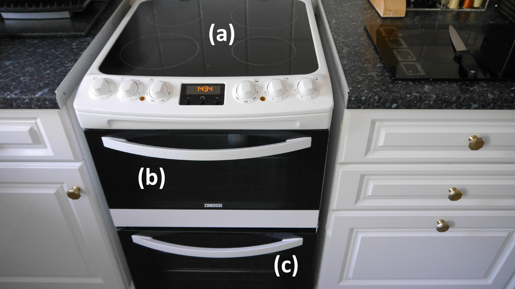 Ever since I moved in, the grill in my cooker has been a bit iffy and finally it broke. Then a couple of weeks ago the oven broke as well, leaving only the hob functional. But you can’t cook a pizza on the hob :-(. So here is my new cooker. I’ve helpfully labelled the different sections.
