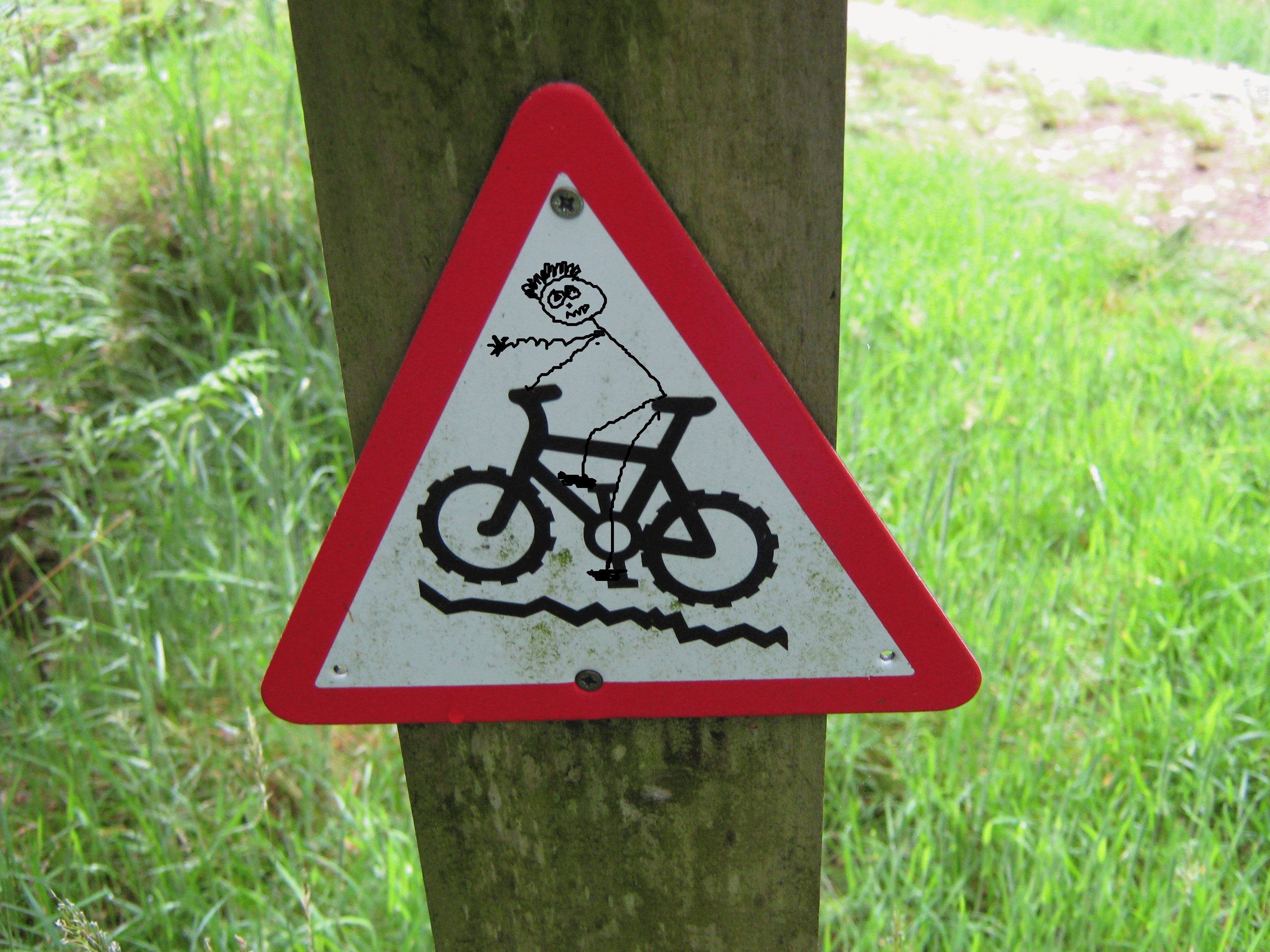 While wandering around a forest in Wales I saw this sign warning cyclists of a rough trail ahead.