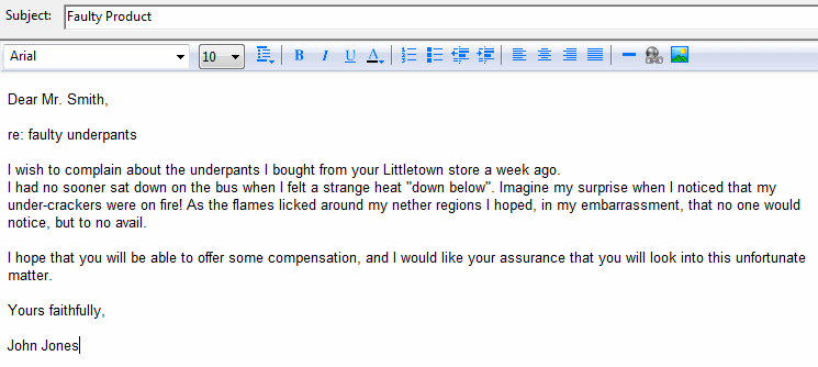 In this scenario, we have bought defective goods. Maybe we should write a letter, but who has the time? Such an email needs to be fairly formal – “Hi Mr Managing Director” will not do. Take a look at a model example below.