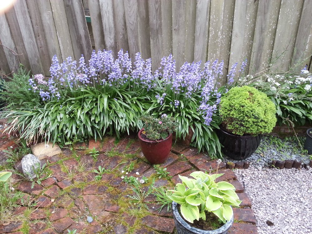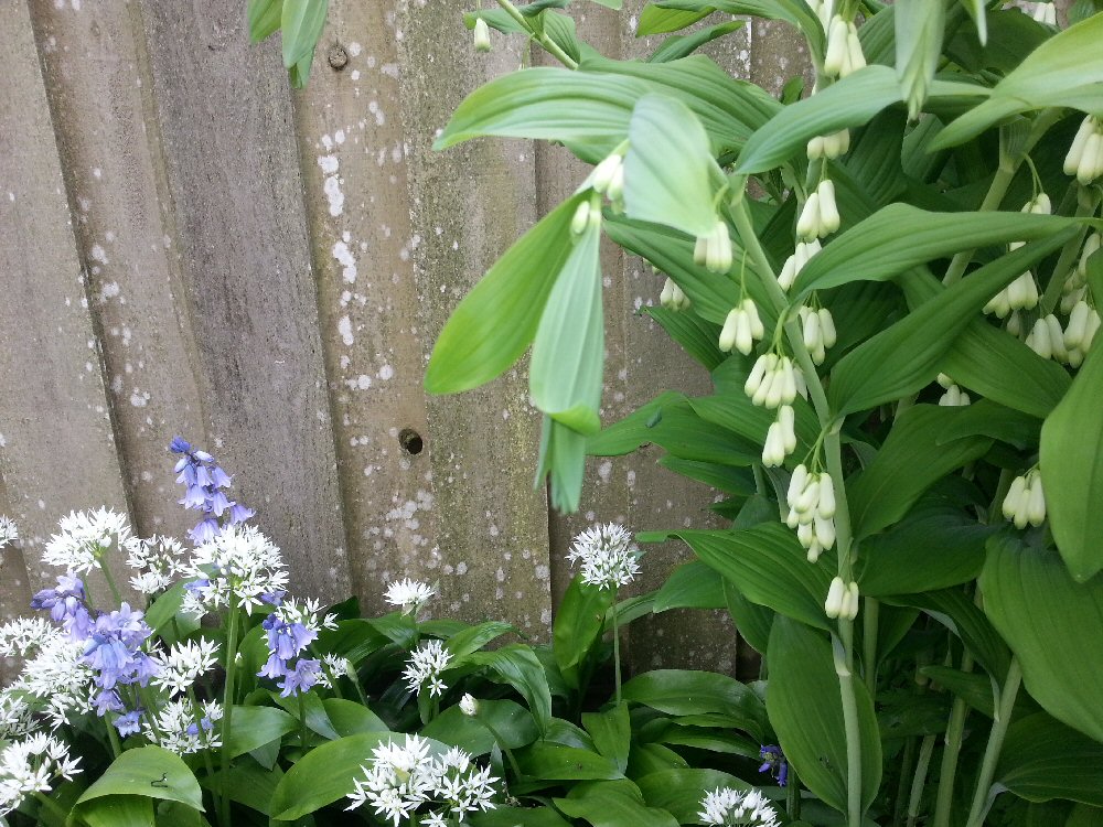 Here is a picture of bluebells, according to my parents. I admit that they are bell-shaped, though more purple than blue, I would say. They also reckon that the little white flowers are garlic. Possibly the previous owner was worried about vampires.
